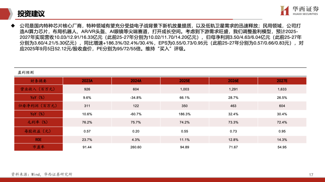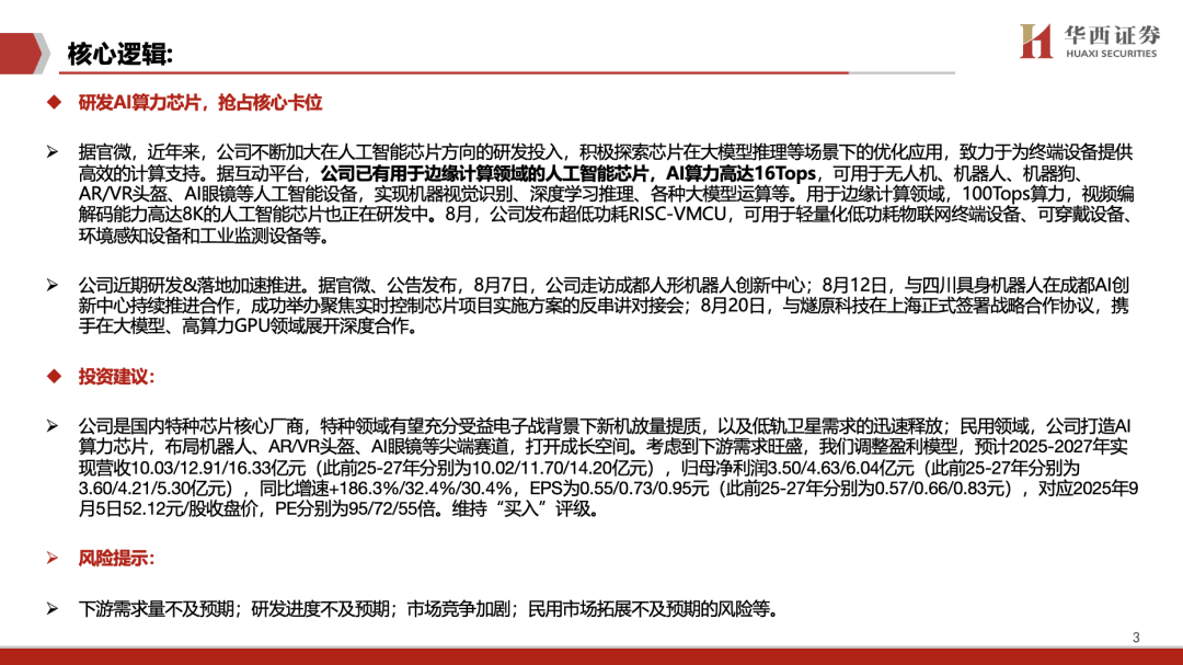 公司是国内特种芯片核心厂商,特种领域有望充分受益电子战背景下新机放量提质,以及低轨卫星需求的迅速释放;民用领域,公司打造AI算力芯片,布局机器人、AR/VR头盔、AI眼镜等尖端赛道,打开成长空间。考虑到下游需求旺盛,我们调整盈利模型,预计2025-2027年实现营收10.03/12.91/16.33亿元(此前25-27年分别为10.02/11.70/14.20亿元),归母净利润3.50/4.63/6.04亿元(此前25-27年分别为3.60/4.21/5.30亿元),同比增速+186.3%/32.4%/30.4%,EPS为0.55/0.73/0.95元(此前25-27年分别为0.57/0.66/0.83元),对应2025年9月5日52.12元/股收盘价,PE分别为95/72/55倍。维持“买入”评级。