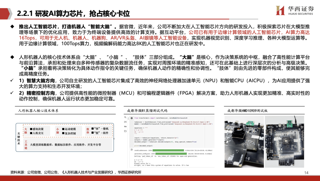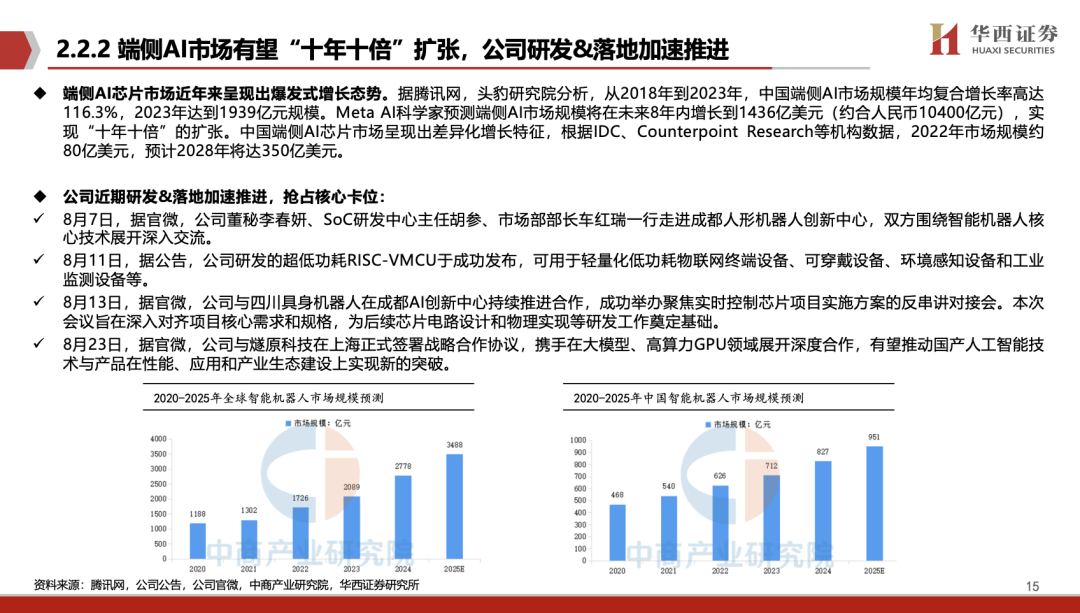 据官微,近年来,公司不断加大在人工智能芯片方向的研发投入,积极探索芯片在大模型推理等场景下的优化应用,致力于为终端设备提供高效的计算支持。据互动平台,公司已有用于边缘计算领域的人工智能芯片,AI算力高达16Tops,可用于无人机、机器人、机器狗、AR/VR头盔、AI眼镜等人工智能设备,实现机器视觉识别、深度学习推理、各种大模型运算等。用于边缘计算领域,100Tops算力,视频编解码能力高达8K的人工智能芯片也正在研发中。8月,公司发布超低功耗RISC-VMCU,可用于轻量化低功耗物联网终端设备、可穿戴设备、环境感知设备和工业监测设备等。