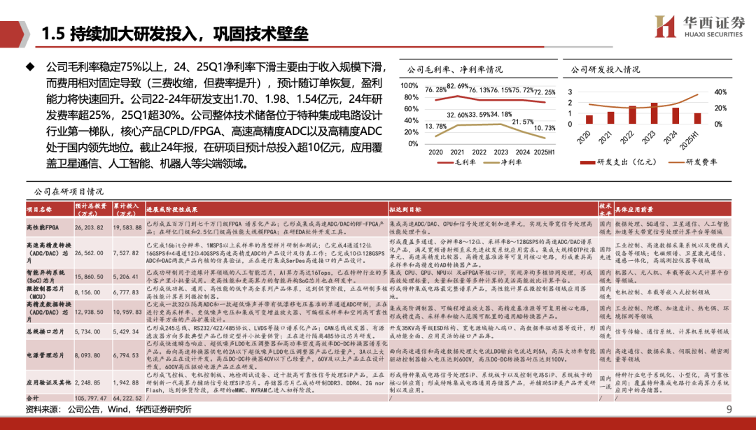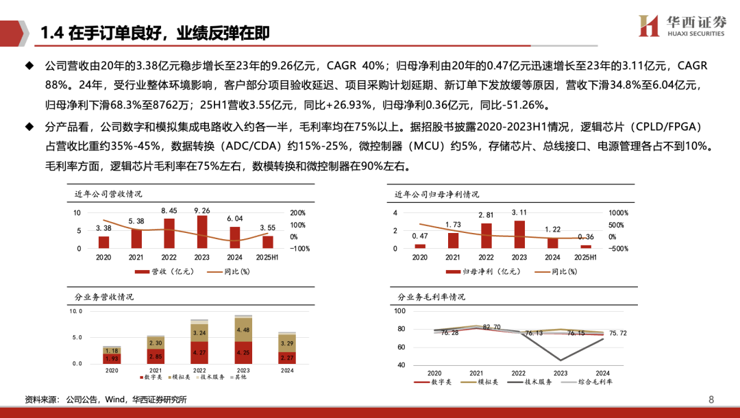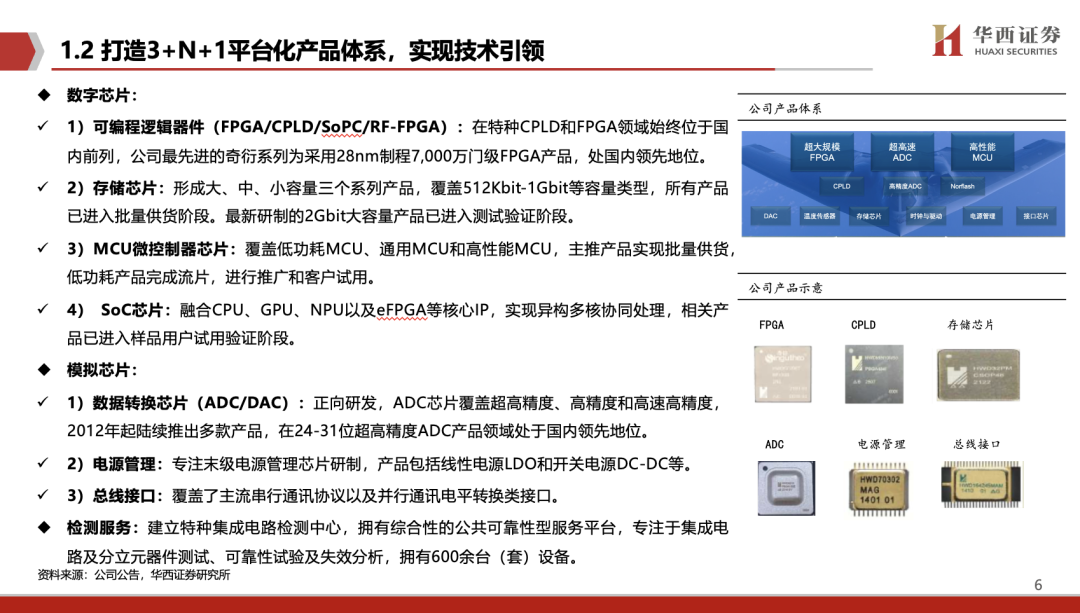 成都华微成立于2000年,2024年科创板上市,作为国家“909”工程集成电路设计公司和国家首批认证的集成电路设计企业,连续承接多个FPGA、ADC、Soc国家重大专项。产品覆盖可编程逻辑器件(CPLD/FPGA)、数据转换(ADC/DAC)、存储芯片、总线接口、电源管理、微控制器等多系列集成电路产品,具备为客户提供集成电路综合解决方案的能力。核心产品CPLD/FPGA、高速高精度ADC以及高精度ADC处于国内领先地位。