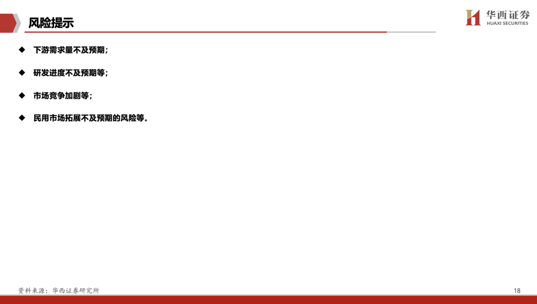 下游需求量不及预期;研发进度不及预期;市场竞争加剧;民用市场拓展不及预期的风险等。