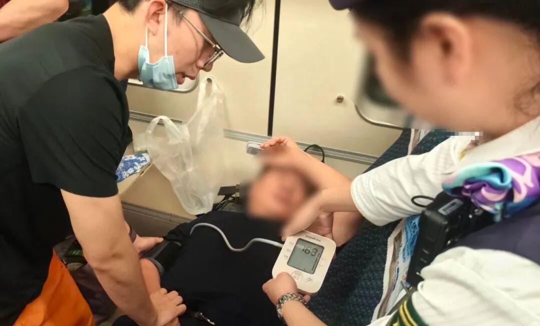接过高铁乘务员递来的急救包,黄任飞立即为老人测量血压、脉氧饱和度和心率。在为老人检测双侧胳膊血压后,排除了主动脉夹层可能,初步判断为冠心病急性发作。