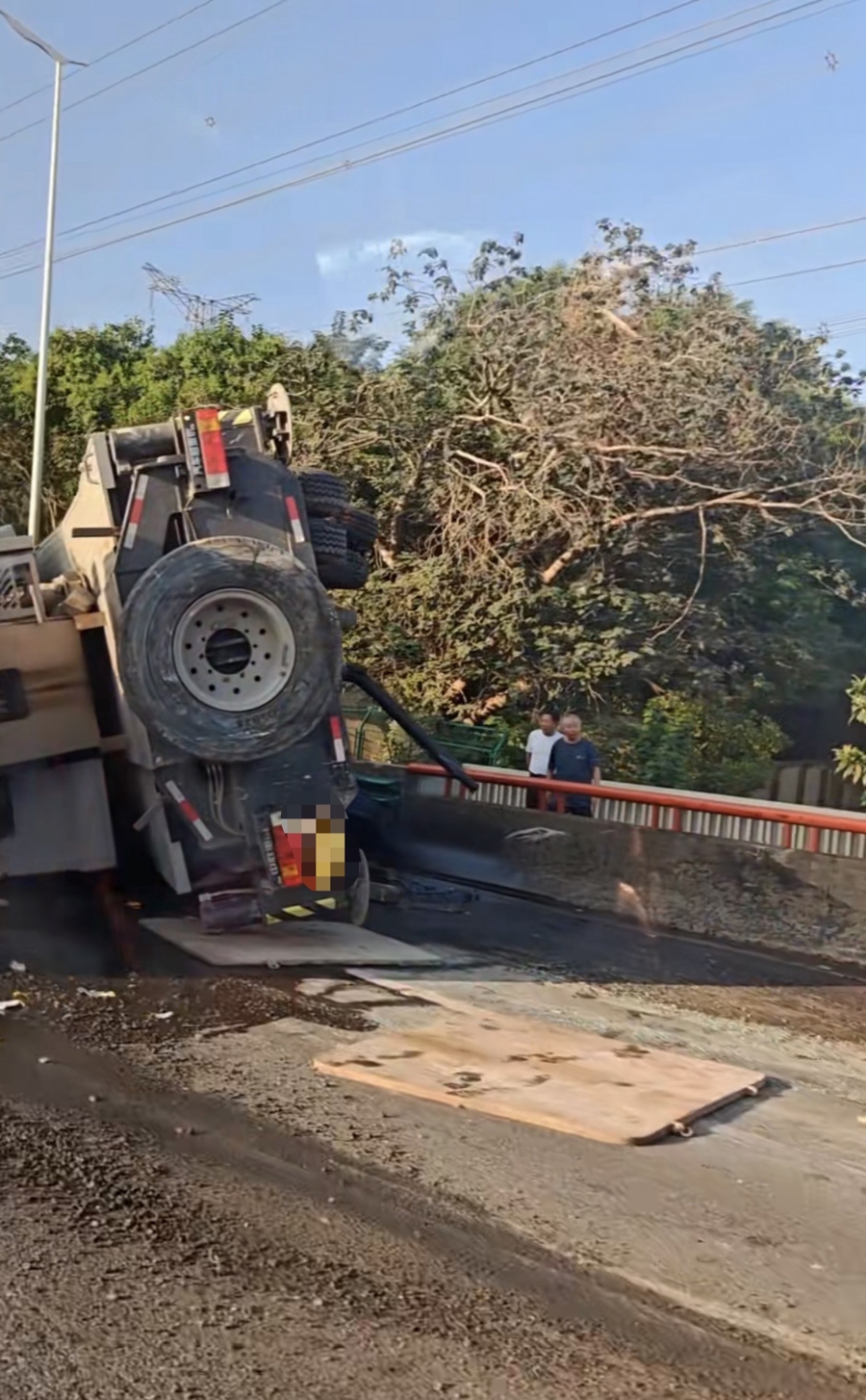 途经现场的市民介绍,一辆大型吊车撞上道路右侧护栏及水泥护墙后,发生了侧翻。轮胎掉落,车损情况严重。