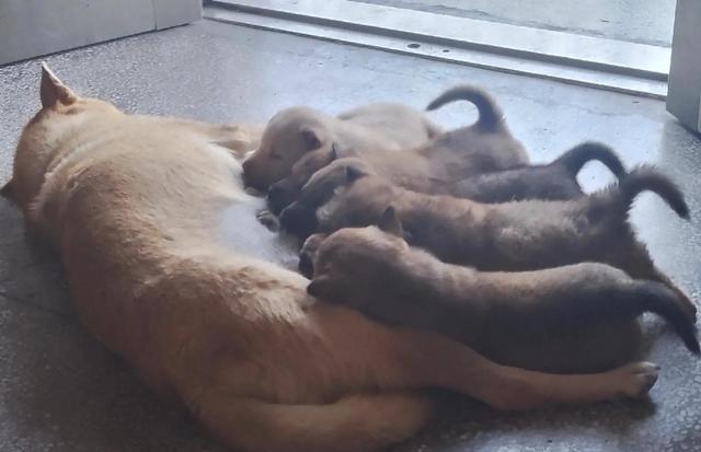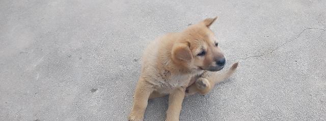 小黄狗跟小白狗一样粘人,比较憨厚稳重,总是在主人吃饭时来挠门,要进来找吃的。